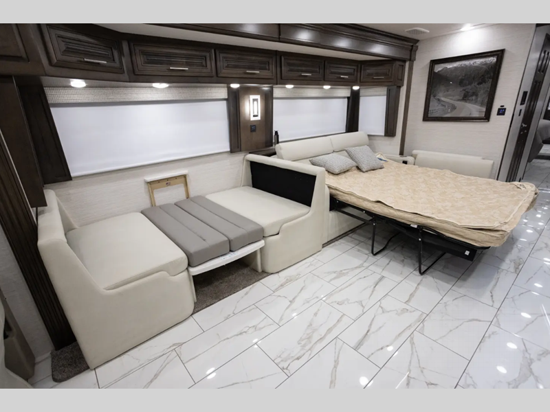 Sleeps 9 Slides 4 Length 44 ft 11 in Ext Width 8 ft 4 in Ext Height 12 ft 9 in Int Height 7 ft Exterior Color Blue Granite, Carmine, Ming Blue, Moonstone Metallic, Mocha Steel Hitch Weight 15000 lbs GVWR 47000 lbs Fresh Water Capacity 103 gals Grey Water Capacity 66 gals Black Water Capacity 42 gals Tire Size 22.5" Generator 10kW Onan Fuel Type Diesel Engine Cummins ISL Chassis Freightliner XCR Raised Rail Horsepower 450 hp Fuel Capacity 150 gals Number Of Bunks 1 Available Beds Tilt-A-View King Torque 1250 ft-lb Refrigerator Type Residential French Door Refrigerator Size 23 cu ft Convection Cooking Yes Cooktop Burners 2 Number of Awnings 2 Axle Weight Front 17000 lbs Axle Weight Rear 30000 lbs Water Heater Type Oasis Hydronic Continuous AC BTU 45000 btu TV Info LR 50" LED TV, BR 43" LED TV, Cab 32" LED TV, Bunks (2) 22" LED TV, Exterior 40" LED TV Awning Info Carefree Latitude with LED Lights & Wind Sensor Washer/Dryer Available Yes Gross Combined Weight 62000 lbs Shower Type Standard Electrical Service 50 amp Similar Floorplans