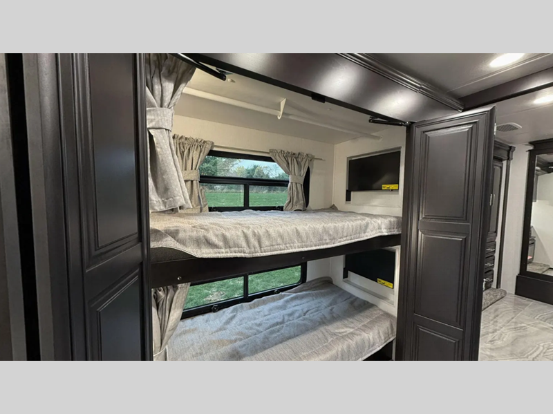 Sleeps 10 Slides 3 Length 44 ft 11 in Ext Width 8 ft 4 in Ext Height 12 ft 9 in Int Height 7 ft Exterior Color Blue Granite, Carmine, Ming Blue, Moonstone Metallic, Mocha Steel Hitch Weight 15000 lbs GVWR 47000 lbs Fresh Water Capacity 103 gals Grey Water Capacity 66 gals Black Water Capacity 42 gals Tire Size 22.5" Generator 10kW Onan Fuel Type Diesel Chassis Freightliner XCR Raised Rail Horsepower 450 hp Fuel Capacity 150 gals Wheelbase 294 in Number Of Bunks 3 Available Beds Tilt-A-View King Torque 1250 ft-lb Refrigerator Type Residential French Door Refrigerator Size 23 cu ft Convection Cooking Yes Cooktop Burners 2 Number of Awnings 2 Axle Weight Front 17000 lbs Axle Weight Rear 30000 lbs Water Heater Type Oasis Hydronic Continuous AC BTU 45000 btu TV Info LR 50" TV, BR 43" LED TV, Cab 32" LED TV, Bunks (2) 22" LED TV, Exterior 40" LED TV Awning Info 18' Carefree Latitude with LED Lights & Wind Sensor Washer/Dryer Available Yes Gross Combined Weight 62000 lbs Shower Type Standard Electrical Service 50 amp Similar Floorplans