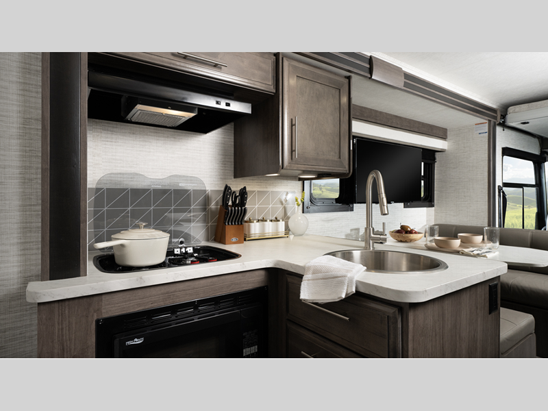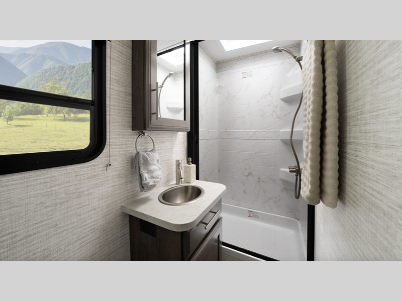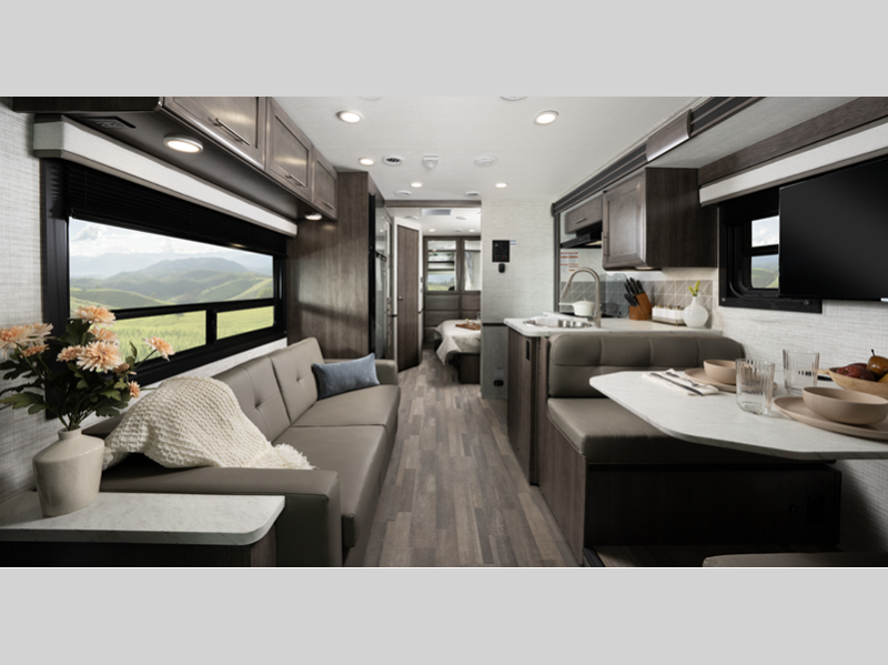 The one-piece, seamless, crowned fiberglass roof is ultra durable, and you'll find plenty of storage space for your gear in the lockable pass-through storage area. And since this coach is under 30' long, you can easily get in and out of campgrounds. Inside, the king bed is sure to bring comfort, and the USB ports in the nightstands will let you charge your phone overnight. A fully equipped kitchen also comes standard, along with a full bath, comfortable seating space, and even an optional drop-down overhead bunk if you need additional sleeping space.