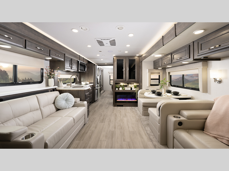 Sleeps 6 Slides 2 Length 39 ft 4 in Ext Width 8 ft 5 in Ext Height 13 ft 4 in Int Height 7 ft Interior Color Aspen, Birch, Walnut Exterior Color Beacon Blue, Breezy Blue, Radiant Silver, Rosy Garnet Full-Body Paint Choices Hitch Weight 12000 lbs GVWR 31000 lbs Fresh Water Capacity 72 gals Grey Water Capacity 91 gals Black Water Capacity 63 gals Tire Size 275/80R22.5G Generator 8,000W Diesel Fuel Type Diesel Engine Cummins ISB 6.7L Chassis Freightliner S2RV Plus Horsepower 360 hp Fuel Capacity 100 gals Wheelbase 279 in Number Of Bunks 1 Available Beds King Torque 800 ft-lb Refrigerator Type Stainless Steel Residential Convection Cooking Yes Cooktop Burners 2 Shower Size 30" x 36" Number of Awnings 1 Water Heater Type Aqua Hot 250D Hydronic AC BTU 30000 btu Basement Storage 155 cu. ft. TV Info LR 40" LED TV, BR 32" LED TV, Exterior LED TV Awning Info 19' 8" Roof-Mounted Girard w/LED Lights Washer/Dryer Available Yes Gross Combined Weight 43000 lbs Shower Type Standard Electrical Service 50 amp Similar Floorplans