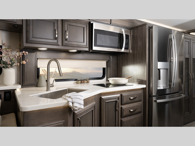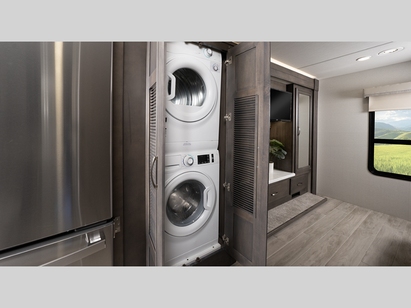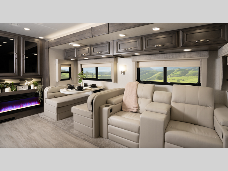Each place you choose to camp will feel like home since you can bring excellent amenities with you, like the exterior entertainment center with outside speakers and LED TV, the Winegard in-motion satellite dish, and the walk-around king-size bed. You'll also have some high-quality tech features to use, like the Aqua-Hot 250D hydronic water and heating system, the 8,000W diesel generator with auto-gen start, and the 200W solar panel with a dual controller!
