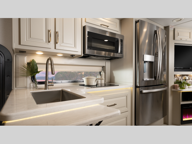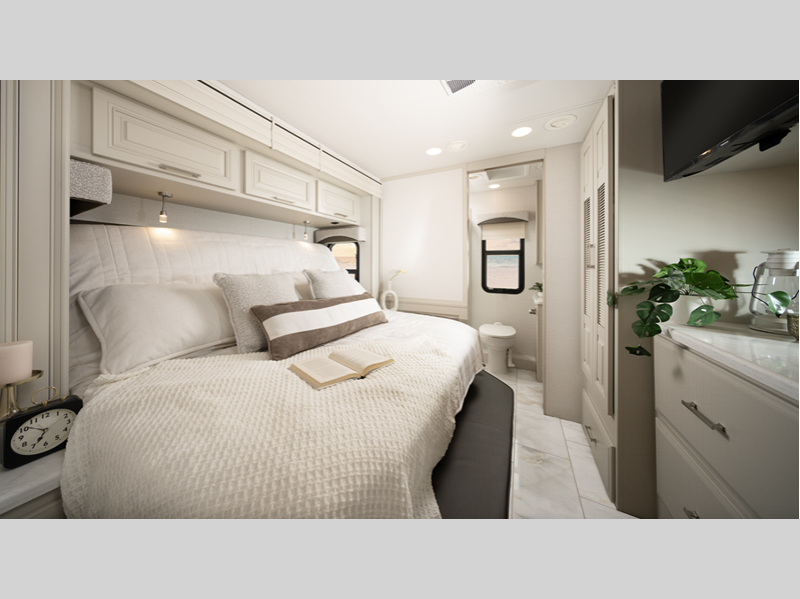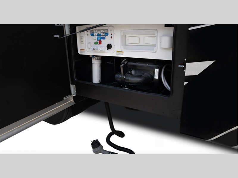 Each place you choose to camp will feel like home since you can bring excellent amenities with you, like the exterior entertainment center with an LED TV, the Winegard in-motion satellite dish, and the walk-around king-size bed. You'll also have some high-quality tech features to use, like the Aqua-Hot 250D hydronic water and heating system, the 8,000W diesel generator with auto-gen start, and the 200W solar panel with a dual controller!