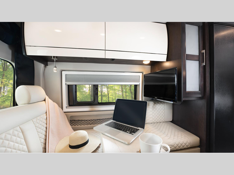 The interiors are designed with the best features including Tecnoform European-style, high-gloss cabinetry, the Firefly total coach control system, and a power rear sofa for high-end luxury to the van life. Go off the grid with an Onan 2800W generator with auto-gen start, and enjoy clean water with the water filtration system. Sliding vented windows allow you to enjoy some fresh air without having to walk outside for it.