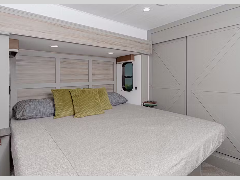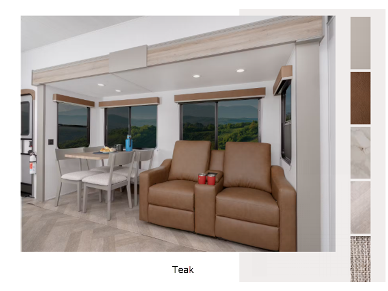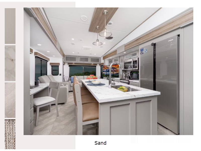 Sleeps 4 Slides 3 Length 39 ft 5 in Ext Height 13 ft 4 in Interior Color Teak, Sand Hitch Weight 2240 lbs Dry Weight 11285 lbs Cargo Capacity 2615 lbs Fresh Water Capacity 75 gals Grey Water Capacity 78 gals Black Water Capacity 44 gals Tire Size ST235/80R16E Furnace BTU 35500 btu Available Beds King Refrigerator Type 12V Refrigerator Size 16 cu ft Cooktop Burners 3 Shower Size 48" x 30" Number of Awnings 1 LP Tank Capacity 30 lbs Water Heater Type Girard Tankless On Demand TV Info LR LED HDTV Awning Info 17' Electric with Friction-Hinge Adjustment, LED Lights, and Manual Override Axle Count 2 Washer/Dryer Available Yes Number of LP Tanks 2 Shower Type Standard Similar Floorplans