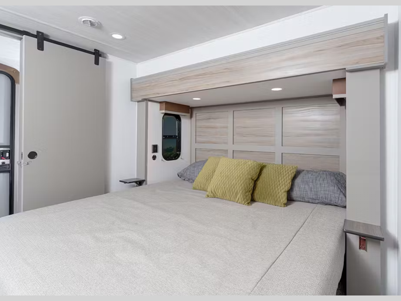 Sleeps 7 Slides 4 Length 42 ft 9 in Ext Height 13 ft 4 in Interior Color Teak, Sand Hitch Weight 2490 lbs Dry Weight 13250 lbs Cargo Capacity 3150 lbs Fresh Water Capacity 75 gals Grey Water Capacity 122 gals Black Water Capacity 78 gals Tire Size ST235/80R16G Furnace BTU 35500 btu Available Beds King, King Refrigerator Type 12V Refrigerator Size 16 cu ft Cooktop Burners 3 Shower Size 48" x 30" Number of Awnings 2 LP Tank Capacity 30 lbs Water Heater Type Girard Tankless On Demand TV Info LR LED HDTV Awning Info 10' and 17' Electric with Friction-Hinge Adjustment, LED Lights, and Manual Override Axle Count 2 Washer/Dryer Available Yes Number of LP Tanks 2 Shower Type Standard Similar Floorplans