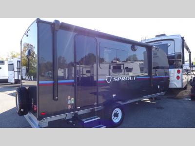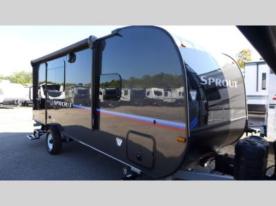 The Sprout travel trailers by Keystone are premium single-axle units that are sure to make an impression at the campground. Each one is built with .040 smooth front medal, one piece heated and enclosed underbelly, power tongue jack. There are also tinted safety glass windows, quick drop stabilizer jacks, and an exterior shower with hot and cold water. Inside, you will enjoy blackout night shades and a 78" interior height, along with an ultra-bright LED light strip and solid surface countertops in the kitchen. The 13,500 BTU A/C and 20,000 BTU furnace will keep you comfortable, and the Suburban tankless water heater is a convenience you won't want to camp without!