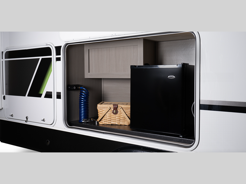 Each is built with TuffShell vacuum bonded laminated construction, reinforced with heavy-duty fiberglass and welded aluminum frames, and includes 50 amp service, Equa-Flex axle suspension and self-adjusting electric brakes. Inside the GSL you will appreciate the pet and kid friendly residential vinyl flooring, hardwood cabinet doors, flush floor slides, plus so much more depending on which you choose. You'll also love the Smart HDTV for movie nights or rainy camp days!